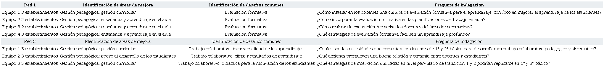 En la Red 2 el trabajo fue más inductivo, pues cada establecimiento seleccionó un área de mejora en la que tanto docentes como directivos pudieran generar un ciclo de indagación colaborativa con acciones orientadas hacia el mejoramiento de la gestión pedagógica en sus establecimientos. Posteriormente, junto con los coordinadores de red se realizó un análisis colectivo de los desafíos que los equipos directivos enfrentan en sus establecimientos. El foco escogido fue fomentar la colaboración entre docentes para mejorar sus prácticas pedagógicas. Finalmente, se identificó una pregunta de indagación por cada equipo que pudiese ser respondida de forma conjunta durante el desarrollo del estudio, tomando en cuenta las necesidades de los establecimientos y los aprendizajes de los estudiantes. En el Cuadro 1 se pueden apreciar las áreas de mejora, los desafíos comunes y la pregunta de indagación de cada uno de los equipos de las dos redes.