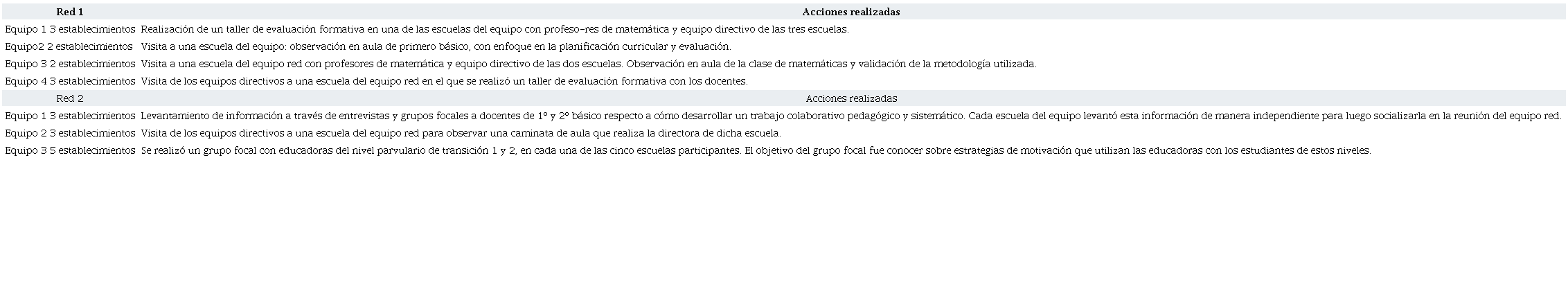 El trabajo en red, tal y como lo muestra la experiencia de escuela nueva en Colombia y redes de tutoría en México, favorece un cambio cultural en la forma de entender esta relación; en este cambio paradigmático el liderazgo de los directivos tiene un rol fundamental (Rincón-Gallardo, 2020). Entre las acciones que se desarrollaron para lograr estos objetivos se halla la realización de talleres con profesores de matemática y equipo directivo de las escuelas de uno de los equipos, la visita entre escuelas, la observación en aula y la validación de la metodología utilizada por los miembros de la red. Todas estas acciones han sido destacadas por la Agencia de Calidad de la Educación (2018) como características de aquellos establecimientos que obtienen buenos resultados de desempeño educativo.