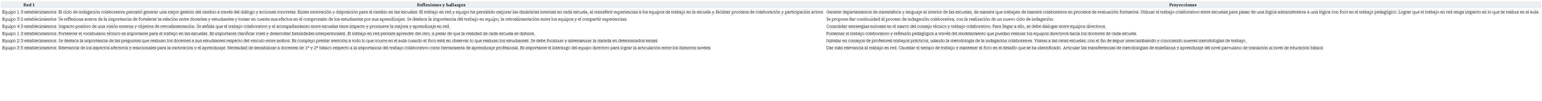 En este taller final se reunieron los integrantes de las redes 1 y 2 junto con los coordinadores del DEM que acompañan a las distintas redes de la comuna. Durante el Café del mundo los equipos reflexionaron acerca de las acciones realizadas, así como sobre los hallazgos y resultados obtenidos. Asimismo, realizaron una proyección en torno al tema de indagación y la posibilidad de realizar un nuevo ciclo de indagación colaborativa, para lo cual identificaron un nuevo desafío. En el Cuadro 3 se presentan las reflexiones y proyecciones de cada equipo.