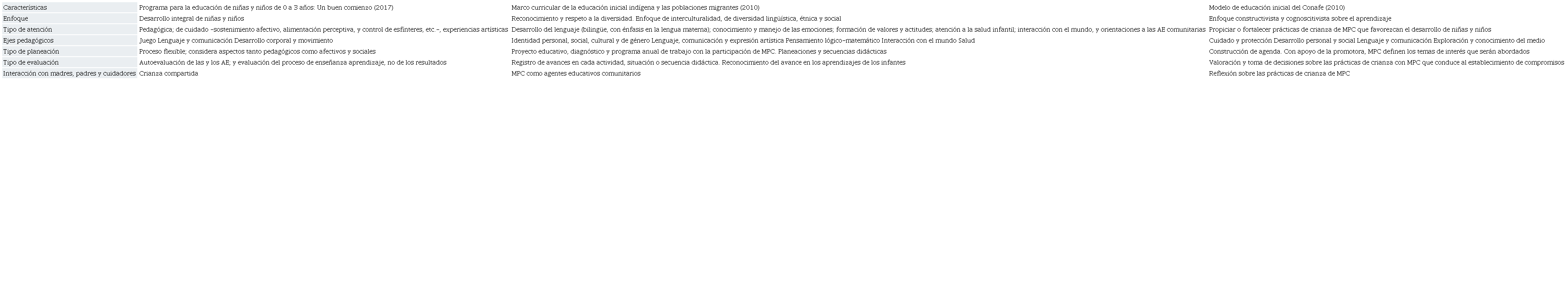Las características principales de cada programa o modelo, en particular de la práctica de las y los agentes educativos, se sintetizan en la Tabla IE.2: