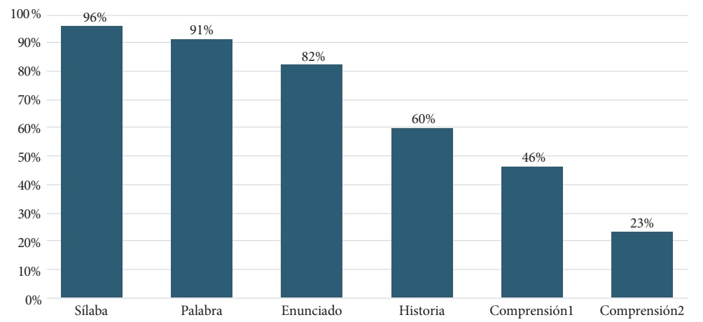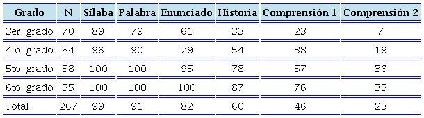 Como se aprecia en la Tabla 3, a medida que los sujetos avanzan en grado escolar obtienen mejores resultados: si el 79 por ciento podía leer palabras en 3º grado, en 5º todos los sujetos pueden leer esas palabras.