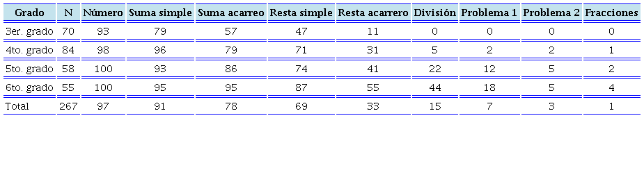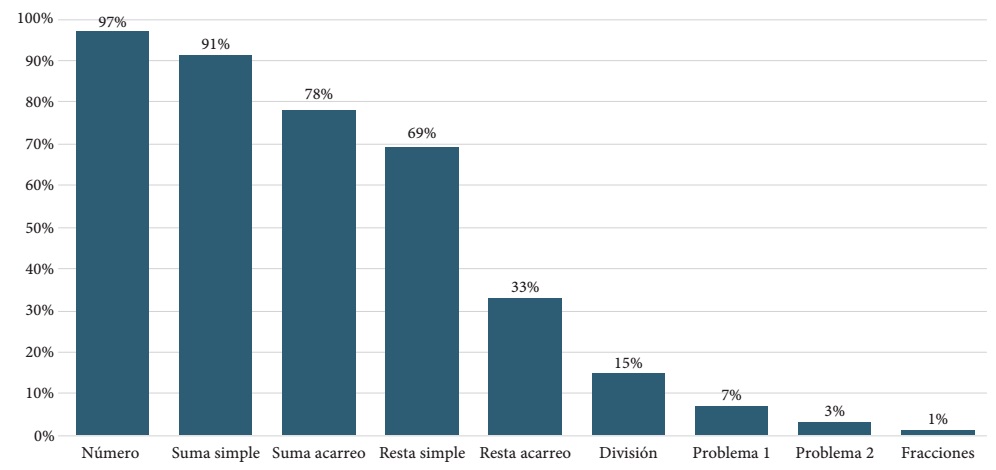 En matemáticas, los resultados sugieren un alto rezago de aprendizajes básicos en la muestra analizada. Si bien prácticamente todos los sujetos pudieron identificar números, y una cantidad importante pudo responder suma simple, a partir de las sumas con acarreo, las restas, y en particular la resta con acarreo, se aprecia un menor nivel de logro (Tabla 4), en todos los grados analizados.