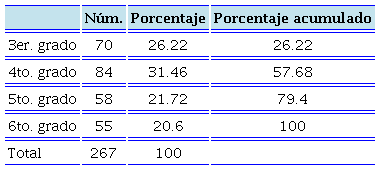En este estudio se contó con 267 participantes habitantes del municipio de Xalapa, Veracruz; 49.4 por ciento hombres y 50.6 por ciento mujeres, entre 7 y 13 años, con una media de edad de 9.48 años (DE=1.218). El 100 por ciento estaba inscrito en escuelas públicas, y cursaban entre 3º y 6º grado de primaria (Tabla 1).