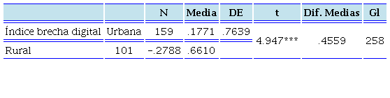 Al indagar en la brecha digital de los niños y niñas de zonas rurales y urbanas se encontró que la conectividad es significativamente mayor en zonas urbanas y la brecha digital significativamente mayor en zonas rurales (Tabla 2).