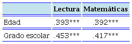 Como era de esperar, se encontraron correlaciones moderadas, pero significativas y positivas entre edad, grado escolar y aprendizajes de lectura y matemáticas básicas (Pearson para edad y Spearman para grado escolar) (Tabla 5).
