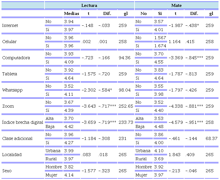 La Tabla 6 muestra las diferencias en las medias obtenidas en los aprendizajes básicos de lectura y matemáticas de acuerdo con las variables de brecha (cada una por separado), así como localidad, clase adicional y sexo. Utilizando t Student para muestras independientes se puede observar que las diferencias significativas en cuanto a la sumatoria de lectura se obtienen entre los participantes que cuentan con WhatsApp y Zoom. En matemáticas, estas diferencias significativas se observan entre los que tienen Internet, computadora y Zoom. No se encontraron diferencias estadísticamente significativas por género. Destaca en la Tabla 7 que los niños y niñas con alta brecha digital resultan significativamente más bajos tanto en lectura como en matemáticas.