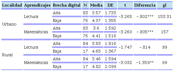 A pesar de no encontrar diferencias significativas en los aprendizajes de lectura y matemática entre localidades rurales y urbanas, cuando se analiza si dentro de los sujetos que viven en comunidades rurales existen diferencias en los aprendizajes dependiendo de su conectividad, se encuentra que los que tienen mayor conectividad obtienen medias más altas en lectura y en matemáticas, y de manera estadísticamente significativa en matemáticas. Cuando se analizan los sujetos que viven en comunidades urbanas, se encuentra que los de brecha digital baja resultan significativamente más altos tanto en lectura como en matemáticas que los que tienen brecha digital alta (Tabla 7), esto es, que su desempeño se asocia con mayor conectividad.