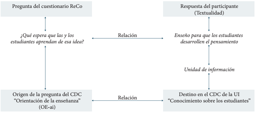 Para la elaboración de los mapas de CDC se relacionaron las preguntas del cuestionario ReCo con el contenido expresado en las respuestas. En el proceso de mapeo asumimos que cada pregunta del ReCo se asocia con un componente del CDC (Tabla 1) y, a la vez, las preguntas del cuestionario representan el origen de la relación entre los componentes de dicho conocimiento (Fig. 1).