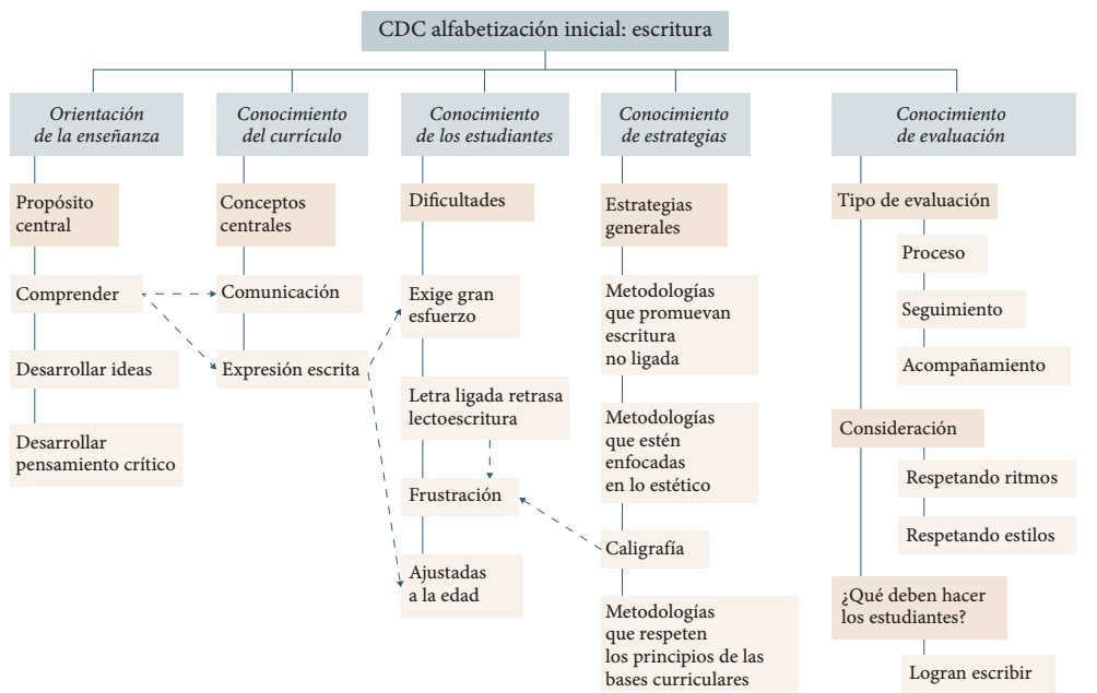 En la Fig. 6 se muestran los elementos e ideas del CDC de Gabriela sobre alfabetización inicial y, en particular, sobre el eje de escritura. Se evidencia que los propósitos centrales de su enseñanza son que las y los estudiantes reconozcan las letras, es decir, puedan leer y comprender lo que leen. En ese marco, reconoce que la escritura es compleja, principalmente porque el estudiantado no identifica el sentido de la escritura, el cual se aprende mecánicamente, generalmente para cumplir con las exigencias curriculares. Para evitarlo, Gabriela trabaja la escritura mediante párrafos cortos y oraciones simples para comunicar ideas. Reconoce algunas dificultades de aprendizaje relacionadas con la comprensión de la lectura y la falta de sentido de la escritura, que se traducen en una actividad mecánica. Gabriela hace énfasis en estrategias específicas para el tema y plantea que la enseñanza de la escritura puede ser mediante libros y textos que se muestran a los estudiantes en láminas de Power Point y son leídos por la profesora. El proceso de enseñanza, según esta profesora principiante, es a través de la asociación de letras/sílabas y lectura por parte del docente para estudiantes que no son lectores. La información permite asegurar que la profesora valora la capacidad de los estudiantes de expresarse de manera escrita. Junto con ello, declara que la evaluación puede ser mediante la comunicación de ideas con oraciones simples y a través de la escritura inicial; también hace alusión a la observación del proceso y plantea que los estudiantes están aprendiendo cuando ya no preguntan o cuando logran escribir de manera autónoma o demuestran que pueden leer solos.