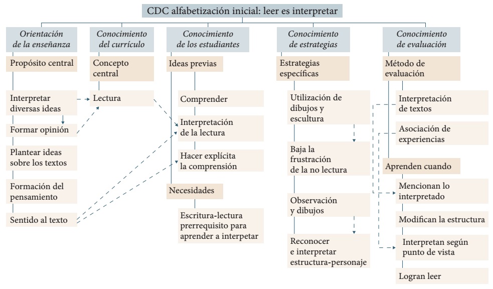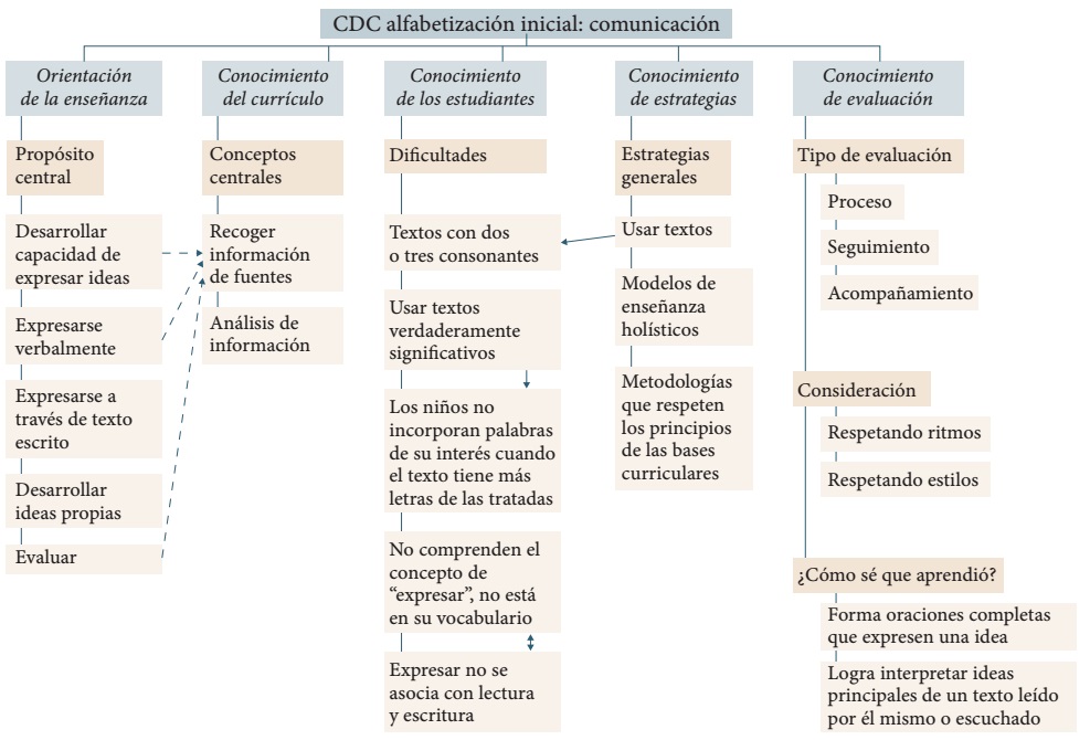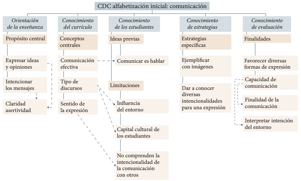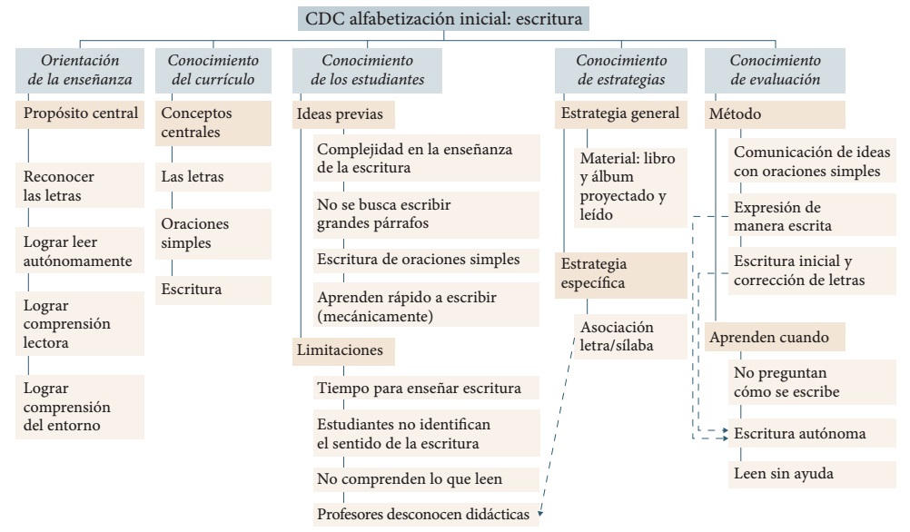 Cuando decidimos mapear el CDC de dos profesoras, una experimentada y una principiante, partimos del supuesto de que la primera daría cuenta de un CDC con mayor integración de sus componentes. Además, esperábamos mayores afirmaciones de tipo procedimental, dado que se ha reportado en algunos profesores que la experiencia da cuenta de más esquemas mentales procedimentales que proposicionales (Stender et al., 2017). Sin embargo, encontramos que las relaciones (ver redes y mapas) que describen los CDC de las profesoras se inscriben o representan modelos de enseñanza de alfabetización inicial tradicional. Esto nos lleva a plantear la necesidad de analizar en profundidad las afirmaciones que vinculan un componente del CDC con otro, y a afirmar que esta forma de explorarlo, a pesar de las restricciones metodológicas que pueda tener, nos permite aproximarnos, en algún grado, a los modelos didácticos que concibe y declara el profesorado.
