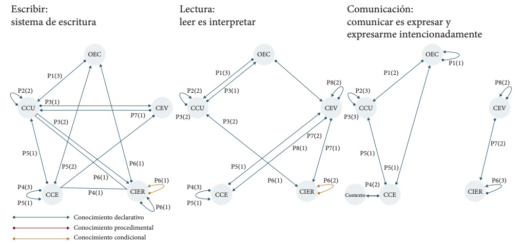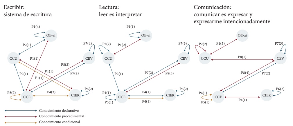 En general, la mayoría de los componentes de CDC-ai establecen, al menos, una relación proposicional con algún otro componente del CDC, que se presenta en la Fig. 5. Del total de proposiciones para los ejes de escritura (n=24), lectura (n=20) y comunicación (n=9), 53 por ciento corresponde a conocimiento declarativo y sólo 9 por ciento alude a conocimiento condicional, entendido como aquél que deja entrever los motivos por lo que se hace o piensa algo. En ese marco, los mayores razonamientos se dieron para el eje de escritura y, en particular, entre el CCU-CIER y el CEE-CIER. El conocimiento procedimental fue predominante para el eje de comunicación (55 por ciento) y escasamente representado para el eje de escritura (16.6 por ciento).