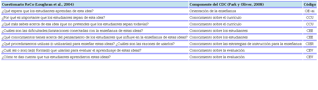Con la finalidad de explorar el conocimiento didáctico de alfabetización inicial (CDC-ai) de las participantes se utilizó un cuestionario escrito de preguntas abiertas (“representación del contenido”, ReCo), ampliamente usado en investigaciones que exploran el CDC de profesores (Espinosa et al., 2010). Este instrumento permite reconocer en cada participante las ideas centrales del contenido en estudio -alfabetización inicial- que fueron: leer, escribir y comunicar. Paralelamente, vinculamos las preguntas del ReCo con los componentes del CDC descrito por Park y Oliver (2008) con el objetivo de favorecer la caracterización de dicho conocimiento por cada participante (Cuadro 1).