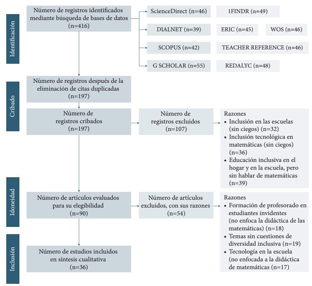 Se obtuvieron, en principio, 416 artículos sometidos a los siguientes criterios de exclusión: se descartaron aquéllos que no estaban relacionados con la inclusión en escuelas con personas ciegas (n=32), seguidos de los estudios que no contenían participantes ciegos en relación con la inclusión tecnológica de las matemáticas (n=36) y, finalmente, se desecharon los artículos que trataban de la educación inclusiva en el hogar y en la escuela, pero sin incluir las matemáticas (n=39). Posteriormente, entre los seleccionados se descartaron los que analizaban la formación de profesores para estudiantes ciegos, pero no se centraban en la enseñanza de las matemáticas (n=18), y también aquellas investigaciones que no incluyen el tema de la diversidad inclusiva (n=19), así como las investigaciones que se basan en la tecnología en la escuela, pero no abordan la enseñanza de las matemáticas (n=17).