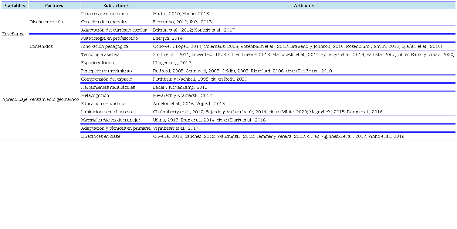 Los estudios que se presentan en esta revisión se caracterizan principalmente por formar parte de contextos internacionales (n=80; 56 por ciento), con escasa presencia de estudios en el contexto latino (Latinoamérica y España) (n=19; 44 por ciento). Lo anterior evidencia la producción científica en el contexto internacional, así como la necesidad de creación de más literatura científica en español, por ser la segunda lengua más hablada en el mundo. El número total de variables es de 16, distribuidas en dos categorías: enseñanza y aprendizaje. A su vez, en cada una de ellas hay diferentes factores sobre los que se categorizan los subfactores de cada variable. En el Cuadro 1 se pueden ver las variables identificadas y su detallada categorización.
