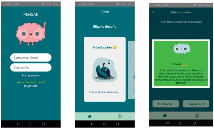 La app considera tres etapas: 1) entrega de información; 2) modelamiento; y 3) construcción. La primera etapa es clave para la comprensión del constructo de pensamiento crítico. Se adaptó el constructo de pensamiento crítico elaborado por (MIDE UC, 2008), incluidas 6 dimensiones: a) selección de información; b) elaboración de tesis; c) argumentación; d) contraargumentación; e) conclusión; y f) autorreflexión de sesgos cognitivos. La segunda etapa guía el proceso de pensamiento crítico a partir de un ejemplo que se va trabajando en cada una de sus fases. Aquí, el estudiante interactúa a partir de estímulos de respuesta cerrada solicitados por la app y la inclusión de preguntas sobre sesgo cognitivo con respuesta de tipo verdadero/falso. La tercera etapa promueve que el estudiante, una vez modelado el pensamiento crítico, active el contenido aprendido al construir sus propias posturas respecto a estímulos propuestos, de los cuales tiene que escoger uno. Dichos estímulos tienen relación con la utilización de robots para el cuidado de los adultos mayores, la libertad para fumar en espacios abiertos y la utilización de productos cosméticos de belleza. Se decidió preguntar por dichos temas porque son variados y pueden representar alternativas de interés para los estudiantes. Junto con ello, se buscó evitar estímulos que pudiesen suscitar prejuicios demasiado marcados. Para este ejercicio se utilizaron campos abiertos en los que los estudiantes escriben directamente sus ideas.