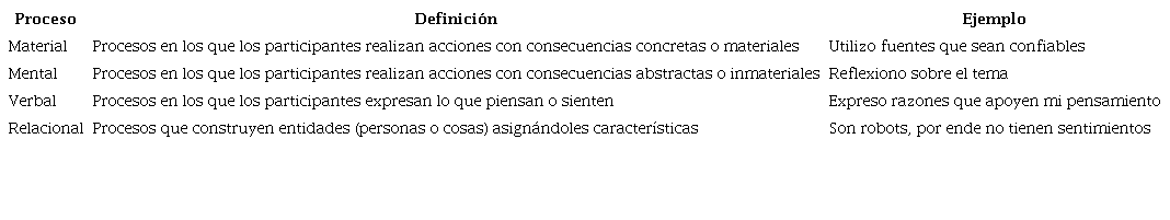 Las distintas alternativas de los procesos tienen lugar según expectativas relacionadas con el contexto; por ejemplo, se espera que en una receta de cocina se configuren expresiones materiales o de “hacer” (corte, revuelva, ponga en el horno), mientras que sería esperable que en un diccionario se construyan expresiones relacionales de “ser” o “tener” (por ejemplo, el pensamiento es un conjunto de ideas). En el proceso de construcción del pensamiento crítico, querríamos que los usuarios produjeran textos en torno a procesos mentales y verbales, puesto que tienen que ver con lo que sucede en la mente y en relación con otros, respectivamente.