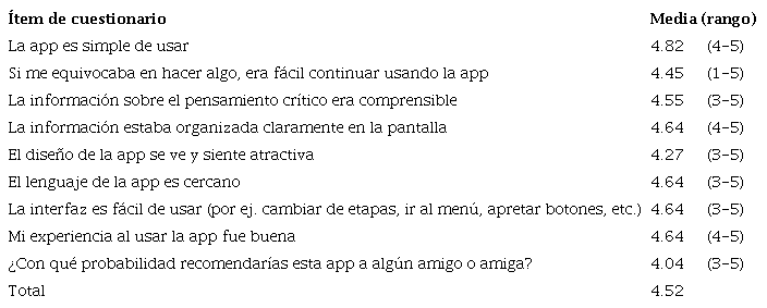 Sumado a lo anterior, se realizó un pilotaje en 11 estudiantes de entre 17 y 22 años. En este pilotaje se exploró la interacción de los estudiantes con la app, así como datos relativos a la construcción del pensamiento crítico. Junto con ello se aplicó un cuestionario para conocer la experiencia y actitud de los estudiantes respecto al uso de la app y la experiencia de aprendizaje. Todos los valores reportaron un alto grado de satisfacción con la app. Esto se puede observar en la Tabla 1, que indica que todas las respuestas son superiores al valor 4. Los estudiantes destacan que: la app es simple de usar; la información está bien organizada; el lenguaje es cercano; la experiencia de uso fue positiva. Además, las sugerencias de las preguntas abiertas fueron incorporadas a la nueva versión de la app.