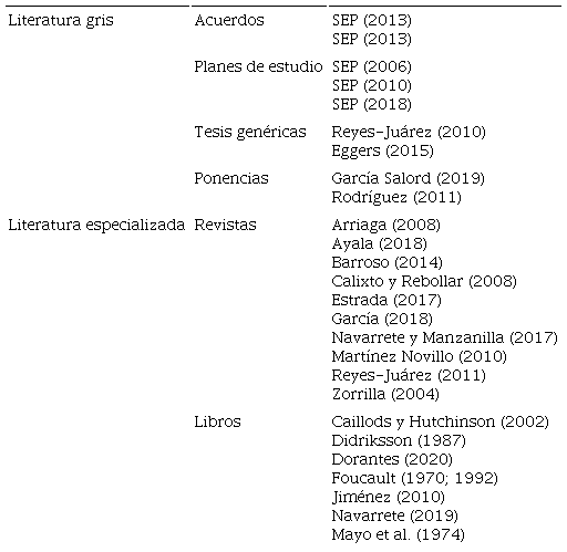 c. El referente empírico. Al tomar como base que la herramienta genealógica de Foucault es considerada gris y pacientemente documentalista (Rujas Martínez-Novillo, 2010; García, 2018; García Salord, 2019), se conformó un referente empírico a partir del cual se consideró una serie de documentos que contemplan las fuentes primarias (Tabla 1), mismas que brindan información para construir la narrativa de la historia de la telesecundaria. Se consideraron los puntos de surgimiento y la lucha de fuerzas orientadas a la conformación de su genealogía, las cuales han estado en cada una de las fases de su constitución, desde su inicio en 1968; se trata de una propuesta que partió de las características políticas, económicas, sociales y culturales propias del contexto, hasta el 2021, en que las reformas han moldeado su situación actual.