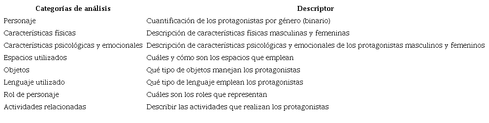 El contenido de los 40 cuentos infantiles se analizó mediante una adaptación del instrumento empleado por López Prat (2014), el cual tenía como finalidad discriminar elementos o aspectos sexistas en los protagonistas de los cuentos. En el Cuadro 2 se presentan las categorías establecidas. Se utilizó el método de análisis de contenido, ya que “permite investigar el contenido de las comunicaciones mediante la clasificación en categorías de los elementos o contenidos manifiestos de dicha comunicación o mensaje” (Aigneren, 1999: 1).