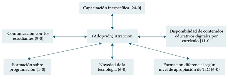 Este proceso incluye los discursos asociados a formas de aproximación inicial de los docentes a las TIC y que los motiva para continuar con el proceso de apropiación. La Fig. 2 presenta la red semántica de las categorías emergentes que describen el proceso de atracción como orientación positiva en la adopción docente de las TIC.