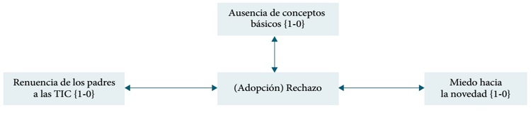 Este proceso incluye los discursos asociados a formas de distanciamiento inicial de los docentes respecto de las TIC y que los desmotiva para continuar con el proceso de apropiación. La Fig. 3 presenta la red semántica de las categorías emergentes que describen el proceso de rechazo como orientación negativa en la adopción docente de las TIC.