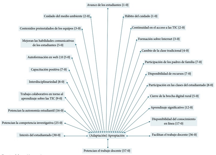 Este proceso incluye los discursos asociados a formas y aspectos de la incorporación de las TIC en las prácticas de enseñanza-aprendizaje después de haber realizado una exploración inicial durante el proceso de atracción. La Fig. 4 presenta la red semántica de las categorías emergentes que describen el proceso de apropiación como inserción positiva en la adaptación docente de las TIC.
