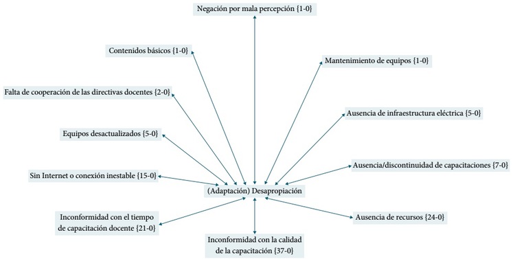 Este proceso incluye los discursos asociados a formas y aspectos de la no incorporación de las TIC en las prácticas de enseñanza-aprendizaje, después de haber realizado una exploración inicial durante el proceso de atracción o después de haber realizado una apropiación. La Fig. 5 presenta la red semántica de las categorías emergentes que describen el proceso de desapropiación como abandono progresivo de las TIC en la adaptación docente.