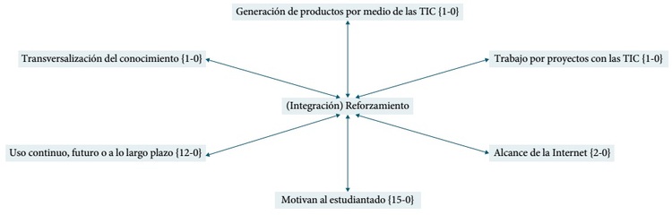 Este proceso incluye los discursos asociados a formas y aspectos de la rutinización de las TIC en las prácticas de enseñanza-aprendizaje, después de haber realizado una incorporación durante el proceso de apropiación. La Fig. 6 presenta la red semántica de las categorías emergentes que describen el proceso de reforzamiento como habituación positiva en la integración docente de las TIC.