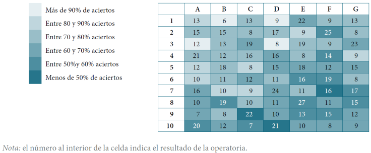 Se eligió comenzar con la evaluación de cálculo mental en sumas debido a que es la operatoria aritmética que les resulta más familiar. Esto se ve evidenciado en el estudio de lexicón de Ferreira et al. (2014), en el cual se reporta que la palabra con mayor índice de disponibilidad léxica es “suma”, de alto uso también en los distintos niveles educativos de la enseñanza secundaria, seguido por las palabras multiplicación, resta y división, que corresponden a las otras tres operaciones básicas; en estas últimas, las operaciones inversas son las menos evocadas.