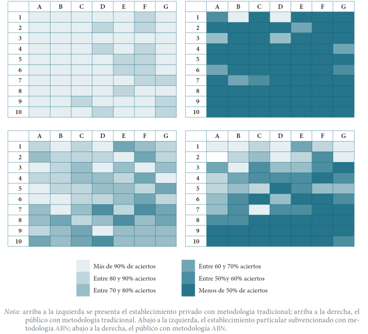 Se puede observar una marcada diferencia entre el porcentaje de respuestas correctas del establecimiento público de metodología tradicional respecto de su par con metodología ABN, incluso a nivel de las respuestas en ítems considerados de menor dificultad, como pueden ser los de dos dígitos. De la misma manera, aun cuando existen diferencias, se observa bastante cercanía entre los resultados del colegio privado con metodología tradicional y el subvencionado con metodología ABN.