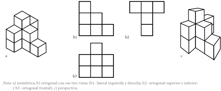 Las representaciones 2D que reflejan la tridimensionalidad de un objeto se realizan con técnicas de dibujo como sombras, opacidad/transparencia o tonos de grises. Por ejemplo, las de perspectiva, oblicuas y axonométricas, cada una con reglas explícitas para su trazo. En consecuencia, construir estas representaciones no sólo es copiar lo que se ve, sino usar sistemas simbólicos propios de las matemáticas (convenciones) o de las propias representaciones gráficas usadas (Lawrie, 2012). Dado que en la representación plana (2D) se pierde información, en el proceso de interpretación el sujeto deberá reconstruirla para identificar el objeto representado a partir de sus propias experiencias y representaciones interiorizadas. Un buen ejemplo de ello es identificar cubos ocultos.