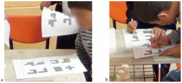 En la actividad 1 el objeto permanecía fijo, con lo cual se fomenta la realización de acciones de movimiento del cuerpo para identificar diferentes vistas. Explorar las diferentes vistas de los módulos multicubos permitió a los niños reconocerlas en su representación en escala de grises. La Fig. 9a representa el módulo multicubo (representación isométrica) que los niños observan físicamente y la Fig. 9b son representaciones ortogonal-frontal de varios módulos multicubos. Los niños debían reconocer y relacionar cuál de las representaciones ortogonales le correspondía al módulo objeto de análisis. Para que ellos diferenciaran la vista frontal de las otras vistas fue necesario construir un sistema de referencia local para identificar esta vista, dada la ubicación de las mesas de trabajo (Fig. 3).