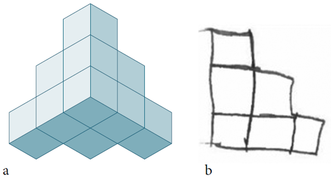En la Fig. 5a se muestra el paso del objeto a un tipo de dibujo de la cara frontal. En este caso, Erica traza un plano esquemático intentando representar un dibujo prerrealista, diferenciado por tres niveles (nivel se refiere a la cantidad de cubos que hay en cada configuración horizontal). Nuestra interpretación del dibujo de Erica es que ella puede reconocer, en el objeto dado, la organización de los cubos en secciones horizontales (filas, de abajo hacia arriba y viceversa), pero no la organización en secciones verticales (columnas, de derecha a izquierda y viceversa). Además, la variación en el tamaño del primero y segundo nivel parece ilustrar la profundidad, lo que ella percibe. En este sentido, Erica reconoce y dibuja el todo del objeto, pero no traza las divisiones verticales. Estos resultados coinciden con las dificultades señaladas previamente por Pani y Dupree (1994) respecto a la percepción de relaciones de perpendicularidad en formas tridimensionales. Por consiguiente, se requiere integrar a la trayectoria propuesta otras actividades que permitan a los niños aprender estrategias para representar este tipo de vistas.