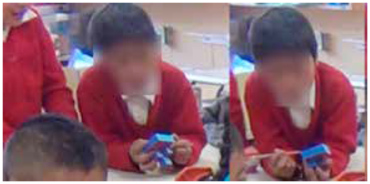 La segunda actividad implicó identificar una vista de un objeto 3D de entre cuatro dadas. El objeto se caracteriza por ser un sólido de madera con colores que diferencian cada vista ortogonal: superior (rojo), lateral derecha (azul oscuro), lateral izquierda (azul claro), frontal (verde), inferior (amarillo) y vista posterior (negro). El objeto no puede moverse, por lo que las acciones de movimiento son del observador. En la Fig. 4b, Carlos y Daniela inclinan su cuerpo para que su campo de visión quede a la misma altura del objeto 3D a observar. Así, ellos reconocen la vista frontal y encuentran el ángulo de visión adecuado para ver, únicamente, el color verde (evidencia de categorías CV, CD).