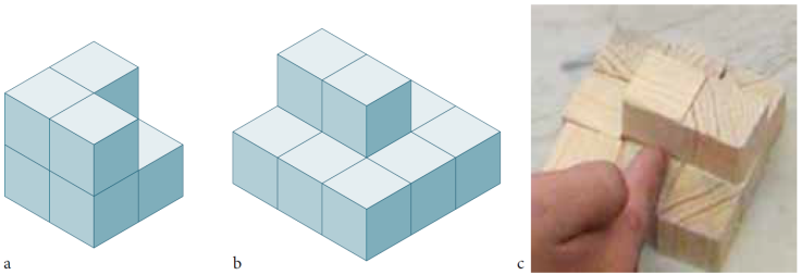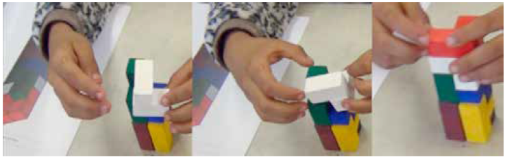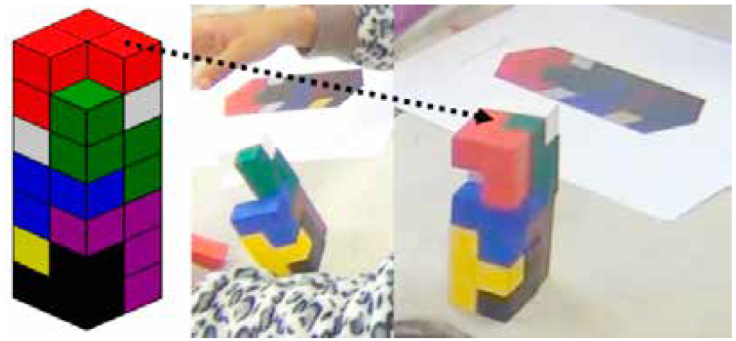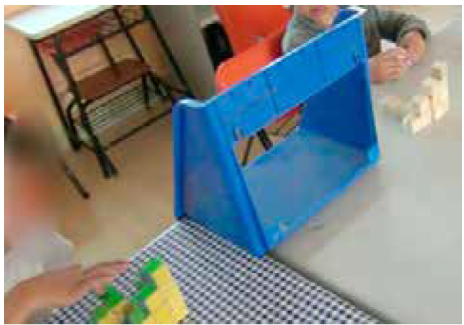 Las tres actividades siguientes involucran construcciones a partir de diferentes informaciones. La actividad 3 de la trayectoria incluye tareas de réplica de un módulo multicubo (Fig. 6). En parejas, un niño da las instrucciones de la ubicación de cada uno de los cubos mientras que el otro sigue estas indicaciones para reconstruirlo. Ninguno de ellos puede ver lo que el otro ve o hace.