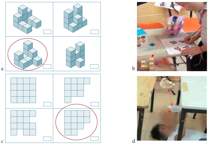Las flechas en la Fig. 4b indican la ubicación de la niña y el niño a fin de reconocer y relacionar distintas vistas. Construir estas relaciones les implicó establecer correspondencia entre el color observado (objeto 3D) y la vista ortogonal (2D) (evidencia de categorías CV, M, CD). Inferimos que la acción de movimiento del cuerpo y, por ende, transitar entre diferentes puntos de referencia respecto al objeto observado (Figs. 3b, 3d, 4b) les permitió discriminar la correspondiente representación 2D (Figs. 3a, 3c, 4a) del objeto observado.