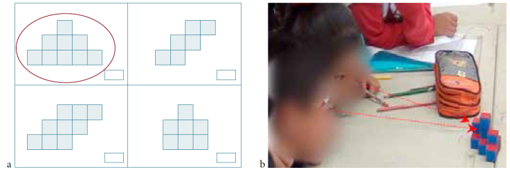 Algunos niños contaban sólo aquellos cubos que percibían completos, y otros únicamente contaban las caras, interpretándolas como cubos. En la Fig. 16a, Luis identificó dos cubos mientras que Mónica fue la única de los 34 estudiantes que identificó los 7 cubos de este módulo. Cuando se le pidió que explicara, ella afirmó que había cubos “escondidos” en el primer nivel y los mostró (evidencia de la categoría CV).