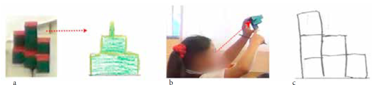 Para identificar la vista inferior, el paso del objeto al dibujo esquemático se ve influenciado por el movimiento del objeto que Erica realiza (Fig. 5b). Al parecer ella representa el todo (la forma de la cara) y sus partes (caras de los cubos) de la vista observada (Fig. 5c). Interpretamos que los dibujos de Erica muestran su desarrollo representacional respecto a la identificación de los cubos que conforman una construcción, diferenciados por niveles (evidencia de categorías CV, CD).