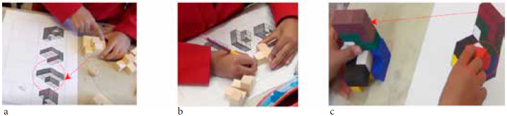 En la última actividad se usaron colores para diferenciar cada policubo (representación y material manipulable, Fig. 7c) y los niños debían reconstruir el objeto representado isométricamente. La complejidad de la actividad consiste en encajar los siete policubos para obtener la construcción representada. Karla usa la superposición con otra finalidad: reconocer la ubicación de un policubo en la representación 2D y ensamblarla en la construcción (evidencia de categorías CV, L, DesC). En ese proceso hizo diferentes movimientos geométricos (traslaciones, rotaciones y giros), estrategia que le permitió encajar el último policubo en el espacio faltante.