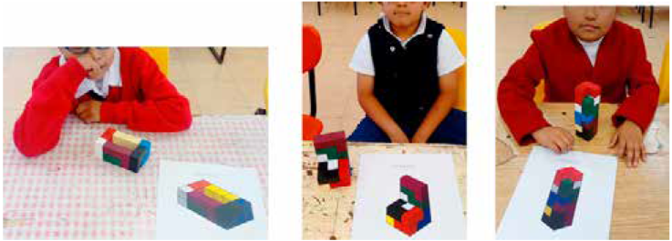 Al replicar cada construcción los niños mostraron avances para identificar cubos y policubos ubicados en una determinada posición. A lo largo de este experimento, el proceso de decodificación se identificó en los estudiantes en las actividades de construcción antes descritas. Acciones que dan cuenta de ello son sus movimientos físicos (transformaciones), como rotación y giros para lograr los ensambles, verbalizar la posición de las piezas por sus colores (encima de alguna pieza, al lado) y reconocer diversas vistas de cada policubo. Las experiencias que favorecieron contrastar la posición y orientación de los policubos, así como los cambios de dimensión (espacio representacional y espacio geométrico) y la invariancia entre la cantidad y formas de los policubos permitieron que los estudiantes avanzaran en el reconocimiento de representaciones de objetos 3D. Además, la comunicación de indicaciones para la construcción generó en ellos la necesidad de usar un lenguaje más preciso para indicar dirección y proximidad.