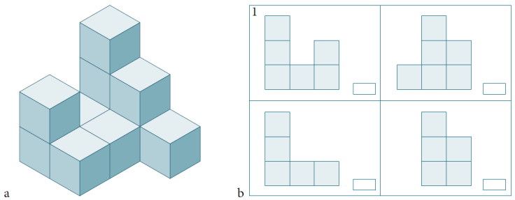 Cambio de dimensión (código CD): reconocimiento de formas 3D con sus correspondientes representaciones 2D (a escala y a partir de diferentes vistas); interpretación del significado de distintas convenciones en las representaciones 2D de formas 3D (tonos de color gris) y su uso; reconstrucción de formas 3D a partir de las vistas.