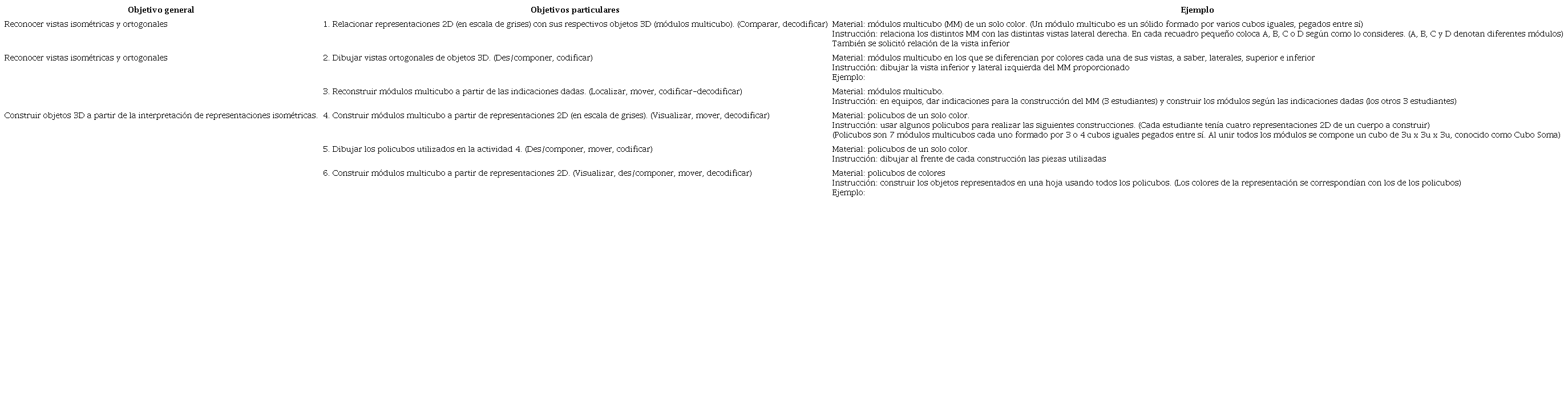 En el diseño de las actividades se pretendió generar experiencias a los estudiantes que promovieran cambios de dimensión (2D ↔ 3D) con el uso de material concreto (deconstruir, situar, sentir e interpretar). En la Tabla 1, se presentan los objetivos y las seis actividades propuestas de esta trayectoria, así como el procedimiento que se favorece en cada actividad.