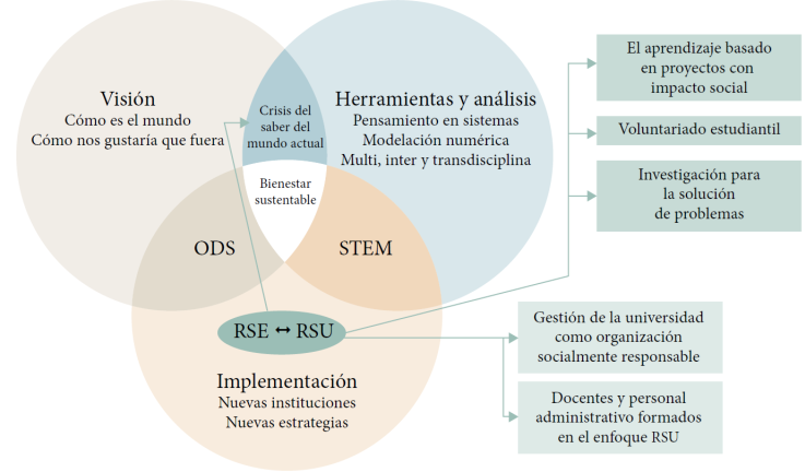 El aprendizaje basado en proyectos con impacto social, voluntariado e investigación para solución de problemas, hace que la universidad responsable no sólo comparta conocimiento, sino que tenga una vinculación activa con la sociedad. La Fig. 1 muestra la articulación de estos componentes: visión, herramientas y análisis, e implementación en el contexto del bienestar sustentable propuesto por Costanza (2020). Se trata de una síntesis transdisciplinar que incluye en su visión los ODS articulados con el enfoque STEM, responsabilidad social universitaria y empresarial para generar componentes para la formación integral de profesionistas y nuevos planteamientos organizacionales para la evolución de las instituciones.
