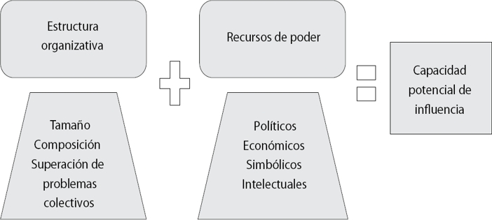 La descripción de la estructura organizativa y la posesión de recursos de poder son los factores subyacentes en la capacidad potencial de influencia de los grupos de interés empresariales (véase diagrama 1). La capacidad potencial de influencia se define como un conjunto de características, referidas a sus estructuras organizativas y posesión de recursos de poder, que de manera agregada en un grupo pueden delinear el resultado de una regulación, de tal manera que sus intereses se mantengan protegidos.