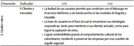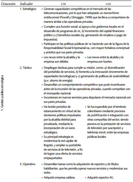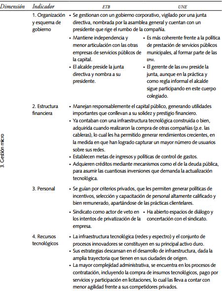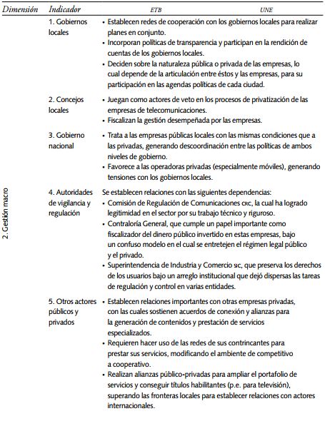 La gestión pública realizada hoy día por ETB y UNE se analizó en las tres dimensiones señaladas en la primera y cuarta secciones. La gestión estratégica, que determina el rumbo tomado por estas empresas y que en buena medida es definida en el ámbito local, por cuenta de las alcaldías, las cuales están controladas políticamente por los concejos locales. La gestión macro, correspondiente al establecimiento de redes con los diferentes actores del gobierno, sector privado y actores de la sociedad civil, que intervienen en el sector, y la gestión micro, relacionada con el modo en que se desarrollan las operaciones al interior de las organizaciones para el cumplimiento de su misión.