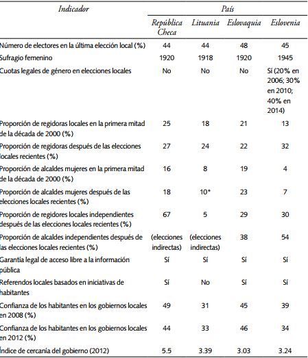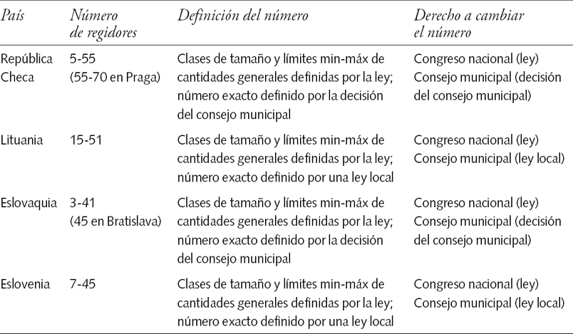 Los consejos municipales, como los cuerpos superiores legislativos y de toma de decisiones en el gobierno local, están compuestos de miembros elegidos por sufragio directo universal por cuatro años en todos los países comparados. En la República Checa hay una diferencia entre los partidos políticos y los partidos electorales. Respecto a los partidos electorales, que registran listas de candidatos para elecciones locales, están definidos por la ley como partidos políticos y movimientos políticos, coaliciones de partidos políticos o movimientos políticos, candidatos independientes, uniones de candidatos independientes, y uniones de partidos políticos, movimientos políticos y candidatos independientes. Los electores tienen el derecho tanto de votar por una lista de candidatos como de elegir y combinar candidatos incluidos en cualquier lista o candidatos individuales que se hayan presentado y registrado oficialmente. Se utiliza un sistema electoral de lista proporcional (donde los electores tienen un número limitado de votos preferenciales), según el método D'Hondt. En Eslovaquia, en una elección de consejo municipal se usa el voto en bloque con principio de mayoría relativa; es decir, cada elector dispone de tantos votos como el número de regidores en el distrito relevante. En las condiciones eslovacas se utilizan distritos electorales de multimandato, y la regla es que el número máximo de escaños en un distrito no puede exceder los 12 escaños. Una regla adicional es que cada distrito debe componerse de alrededor de mil electores, pero debido a la existencia de un alto número de gobiernos locales micro, los distritos más pequeños son bastante comunes. Paradójicamente, mientras que para los gobiernos locales pequeños los distritos más grandes son típicos, en pueblos grandes y ciudades se utilizan distritos bastante pequeños que consisten de unos cuantos mandatos. En Eslovenia, existen dos sistemas electorales diferentes. Si el consejo municipal no tiene más de 12 regidores, entonces se aplica la regla de mayoría simple, y los votantes disponen de tantos votos como sea el número de regidores elegidos (voto en bloque). Si el consejo municipal tiene más de 12 regidores, se usa un sistema electoral proporcional de lista abierta, según el método D'Hondt. Los miembros de los consejos locales en Lituania son elegidos directamente para un término de cuatro años en un sistema de representación proporcional. Ahí se utilizan listas abiertas y cada elector dispone de cinco votos preferenciales. Durante la segunda mitad de la década de 2000, la Corte Constitucional de Lituania encontró inconstitucional el límite legal para las listas de candidatos a escaños en los consejos locales sólo de las listas propuestas por los partidos políticos. Como lo enfatizó la Corte, el uso de un derecho electoral pasivo de cualquier habitante municipal no debería ser determinado por la nominación de un partido político en el caso de elecciones municipales; por lo tanto, las listas de los llamados comités electorales han sido permitidas en las elecciones locales desde las elecciones realizadas en 2011.