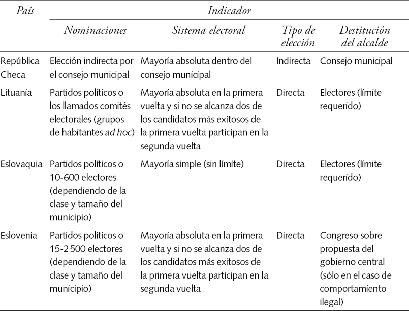 Los alcaldes se eligen con bases diferentes en los países comparados. En Lituania, se han llevado a cabo elecciones indirectas de alcaldes (en 2011 por última vez). No obstante, en las elecciones locales de 2015 se utilizó la elección directa de alcaldes por primera vez. Se requiere una mayoría absoluta para una victoria electoral en la primera vuelta. Si nadie alcanza este número de votos, entonces los dos candidatos con mayor éxito de la primera vuelta continuarán en la segunda vuelta. Sería muy interesante observar el éxito de los llamados candidatos independientes, porque en las primeras dos décadas de la transición los representantes de los partidos dominaron la política local en Lituania. En Eslovenia, el alcalde puede ser un candidato de partido o un candidato independiente con el apoyo de los electores (en este caso 2% del electorado de un municipio que haya votado en la elección previa debe expresar su apoyo por escrito al candidato, pero en cualquier caso se necesitan no menos de 15 y no más de 2 500 firmas). Los alcaldes se eligen con base en la mayoría absoluta en la primera vuelta. Si ningún candidato alcanza el umbral de 50 por ciento más un voto, en la segunda vuelta los primeros dos candidatos compiten por el puesto. Si en la segunda vuelta se obtienen los mismos 50-50 por ciento de los votos, se selecciona un ganador al azar. Los alcaldes se eligen directamente por habitantes municipales también en Eslovaquia. Un sistema electoral llamado "el primero se lleva todo" se utiliza aquí, y se organiza sólo una ronda basada en mayoría relativa. Si dos o más candidatos con el número mayor de votos válidos obtienen el mismo número de votos, se organiza un sorteo electoral para determinar al ganador.