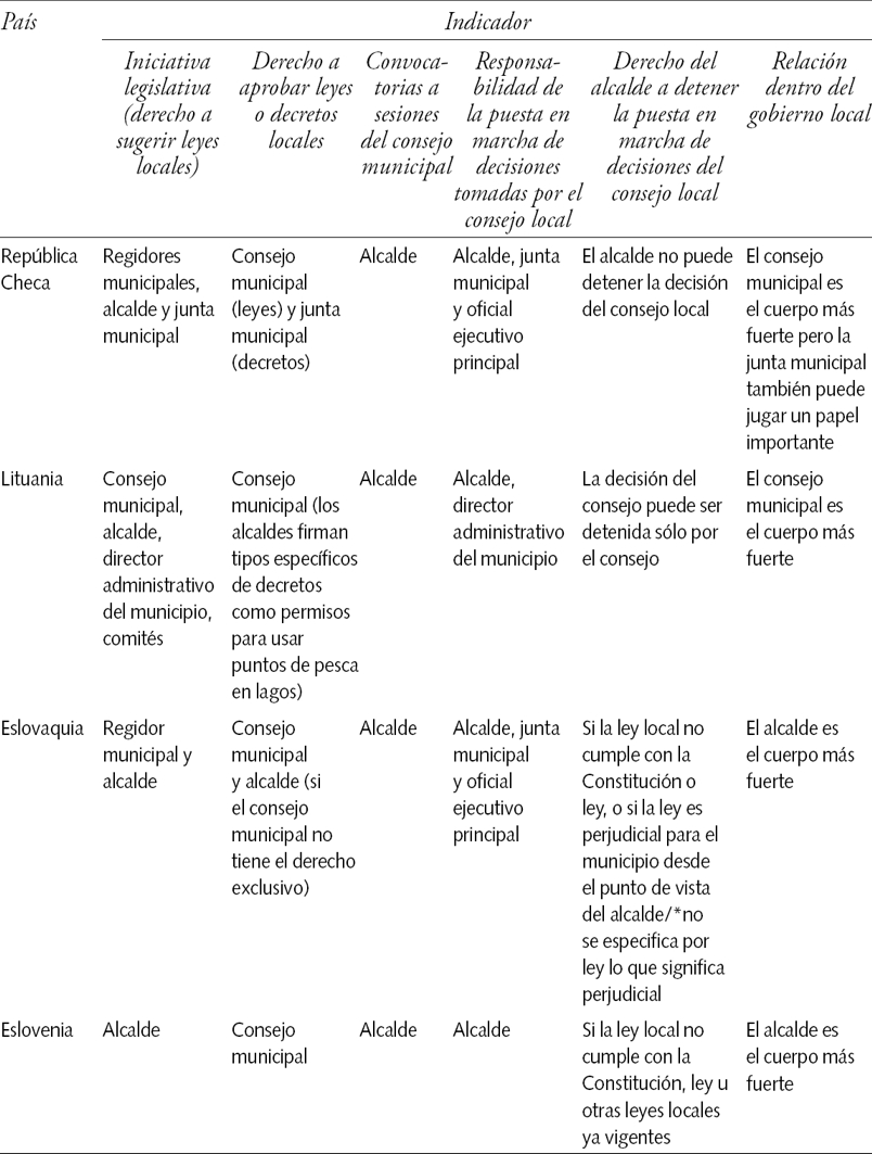 Una reforma en la administración local después de la caída del comunismo también creó la necesidad de una nueva relación (posiblemente más democrática) entre los consejos municipales y los alcaldes (cuadro 3). En Eslovenia la relación entre el consejo municipal y el alcalde está definida legalmente. De esta manera, el consejo municipal y el alcalde están en un tipo de postura entrelazada por la competencia de un alcalde de convocar a reuniones del consejo municipal que él representa también, pero no tiene derecho de votar. Un alcalde prepara propuestas de presupuestos, cuentas finales, otros actos municipales y también detiene su puesta en marcha si hay alguna duda de su legalidad. En cuanto a los gobiernos locales de la República Checa, las relaciones internas dentro de los gobiernos locales están influidas por la existencia de una junta municipal que es elegida por el consejo municipal. Es un cuerpo ejecutivo colectivo que consiste del alcalde, su subdelegado o subdelegados y varios otros regidores municipales. La junta es dirigida por un alcalde e instrumenta decisiones del consejo municipal, aprueba decretos locales, etc. Este cuerpo no se crea en los municipios más pequeños (en ese caso, el alcalde dispone de algunos de sus poderes y el resto de ellos, incluyendo la aprobación de decretos locales, pertenecen al consejo municipal). Un alcalde representa el gobierno local y convoca y dirige las sesiones del consejo municipal. Los alcaldes en las condiciones eslovacas son el cuerpo municipal más fuerte. El tanto convoca como dirige las sesiones del consejo municipal. Además, tiene el derecho de decidir acerca de todo lo que no sea una competencia exclusiva del consejo municipal al mismo tiempo. Aparte, pone en marca especialmente las decisiones del consejo municipal y representa al gobierno local. Como en la República Checa, en Eslovaquia también se puede crear en los municipios un cuerpo consultivo colectivo del alcalde llamado junta municipal.