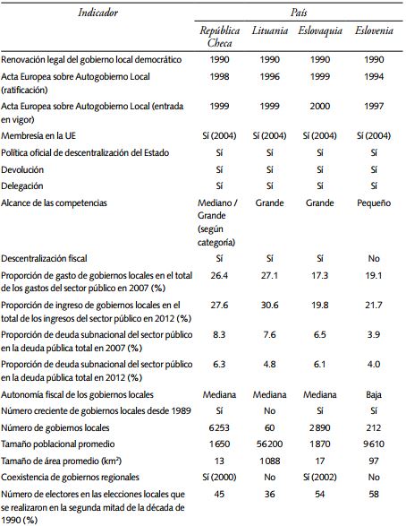 La descentralización es una de las principales direcciones de cambio en las nuevas democracias que emergieron después de la caída de los regímenes comunistas en Europa (Selee y Tulchin, 2004, 295). Sin embargo, está claro ahora que los distintos países han tenido aproximaciones distintas a la descentralización (Ševic, 2005, 11). En lo general, la mayoría de los países poscomunistas experimentaron un tipo de ola de fragmentación después de 1989-1990. Polonia y también Bulgaria son un caso más bien excepcional, porque conservan su estructura de gobierno local. Respecto a los países comparados, la República Checa, Eslovenia y Eslovaquia han experimentado un número creciente de gobiernos locales en las últimas dos décadas. Lituania parece ser un caso único, porque introdujo una reforma estricta de consolidación a mediados de la década de 1990, e inmediatamente se convirtió en uno de los países más consolidados de Europa. Comprender la descentralización como una transferencia de competencias y poderes de la administración estatal a unidades locales o regionales autónomas, o al menos semiautónomas, puede llevarnos a la conclusión de que el panorama es muy diferente, y es más que obvio que distintos países conciben a la descentralización de maneras distintas (véase Illner, 1999). La ola de fragmentación más intensa después de un colapso del régimen anterior se experimentó en Eslovenia, y dentro de este contexto uno podría esperar un alto nivel de descentralización especialmente ahí, pero la realidad es distinta porque casi no ha habido transferencia de competencias estatales al nivel local en Eslovenia (Pinterič y Prijon, 2013).