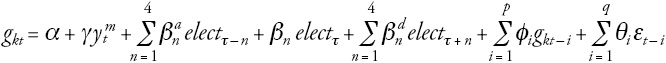 donde gkt denota la tasa anualizada de crecimiento del k-ésimo componente del gasto público o del gasto programable y ytm del producto manufacturero. Si la política fiscal ha sido pro-cíclica, γ > 0, y viceversa. A su vez, electτ-n es la variable dicótoma que capta la fase del CPP antes de la elección de modo que electτ-n=1 para el n-ésimo periodo (n = 1, 2, 3, 4) antes de la τ-ésima elección con τ = (1982.3, 1988.3, 1994.3, 2000.3, 2006.3, 2012.3); 0 en cualquier otro caso.14 Análogamente, electτ+n =1 para el n-ésimo periodo después de la τ-ésima elección; 0 en cualquier otro caso. Por su parte, para el periodo de la elección, electτ =1 durante el τ-ésimo periodo; 0 en cualquier otro caso. son los parámetros a estimar de las variables dicótomas: si existe CPP sus signos serán positivo, positivo y negativo, respectivamente. Finalmente, los términos de las últimas dos sumatorias contienen los términos AR y MA, respectivamente y los coeficientes ϕi y θi son tales que cumplen las condiciones de estacionariedad e invertibilidad.15